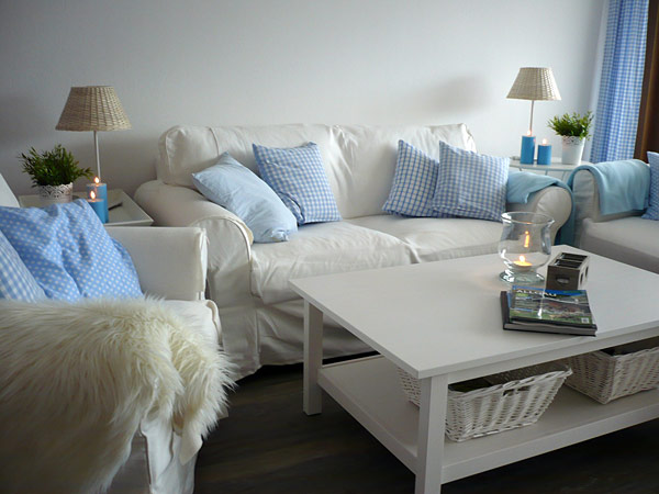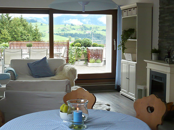 Das stilvolle Wohnzimmer in alpinem Weiß-Blau, warmen Holztönen und großer Fensterfläche bietet ein großzügiges Platzangebot.